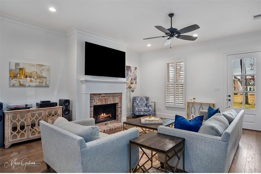 Beautiful home on Greenleaf Park in Provenance, a naturally preserved semi-circle-shaped park surrounded by custom homes and well known for its many community events. The open floor plan is perfect for everyday living as well as entertaining, and the charming front porch welcomes guests with southern appeal. The nearby dedicated parking areas around the park also make hosting guests convenient. The Living Room features a cozy fireplace adding warmth and character to the main level. The Formal Dining space with chandelier sits gracefully between the Kitchen and Living Room creating a seamless flow ideal for gatherings. The Chef’s Kitchen includes a 6-burner gas range, custom vent hood, spacious pantry, to-the-ceiling cabinetry, leathered granite countertops, an oversized island with seating and storage, stainless steel appliances, a water spigot and farm sink. Wet Bar conveniently located off the Kitchen and patio. Three sets of beautiful French doors open to an oversized outdoor patio with a wood ceiling complete with an outdoor kitchen (attached grill, prep space, sink) fans & lighting. The yard is fully fenced. A secluded Master Suite offers a luxurious retreat with double sinks, marble-like tile, quartz countertops, a soaker tub with jets and an oversized walk-in shower. Additional main-level features include a downstairs Guest Suite, oversized Laundry Room with sink and a great drop area off the garage with a Mud Bench. Upstairs, you’ll find a spacious landing perfect for an Office or kids’ playroom along with 3 spacious Bedrooms and a full Bathroom featuring hexagon tile. Beautiful wood flooring spans the main level and plantation shutters are found throughout the home. Walk or ride a golf cart to Rhino Coffee, restaurants, bank, post office and community events. Enjoy the Provenance lifestyle with access to the neighborhood pool, parks, clubhouse and gym.