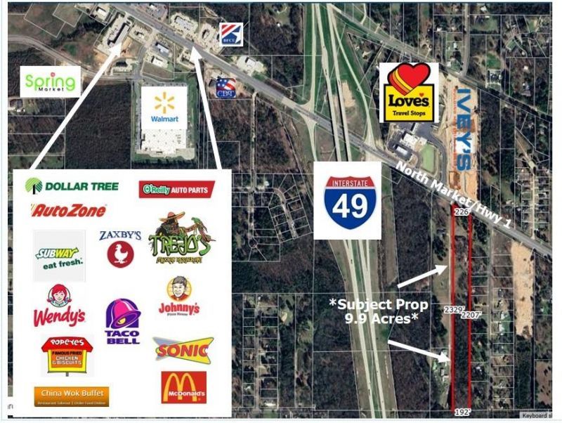 This nearly 10 acre parcel is directly across from Love's Travel and Ivey's Building Material on North Market or Hwy 1 North in North Shreveport. Almost 200' across for road frontage and 2300' deep for your large parcel. You are two driveways away from I-49 exit and entrances. North Shreveport is growing like crazy. Your next commercial venture could be right in the middle of it. I-49, North Market, Hwy 1, I-220 to Bossier or to Texas is only 3-4 miles away. You can also be in downtown Shreveport in less than 10 minutes or when they do open I-49 all the way in, you can be downtown in 5 or less. If your new business loves the water, Caddo & Cross Lakes are minutes away and you can also be to Bossier Water & Lakes in less than 30. Texarkana by way of I-49 is only 70 miles. So much right here at this location. There was a residence here before so there are utilities. Swepco Electric & Delta Utilities (used to be Centerpoint) for gas. There are two working wells for water but also access to Pinehill Water or Blanchard Water if you work either one of those out. If you are not from this area, check out the pics of all the commercial things going on in North Shreveport right now. Property will be zoned into Blanchard as Light Commercial. BRING ALL YOUR QUESTIONS, WE'LL TALK!